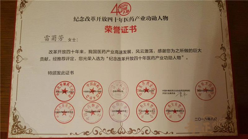 2018年“紀(jì)念改革開放40年醫(yī)藥產(chǎn)業(yè)功勛人物“-雷菊芳