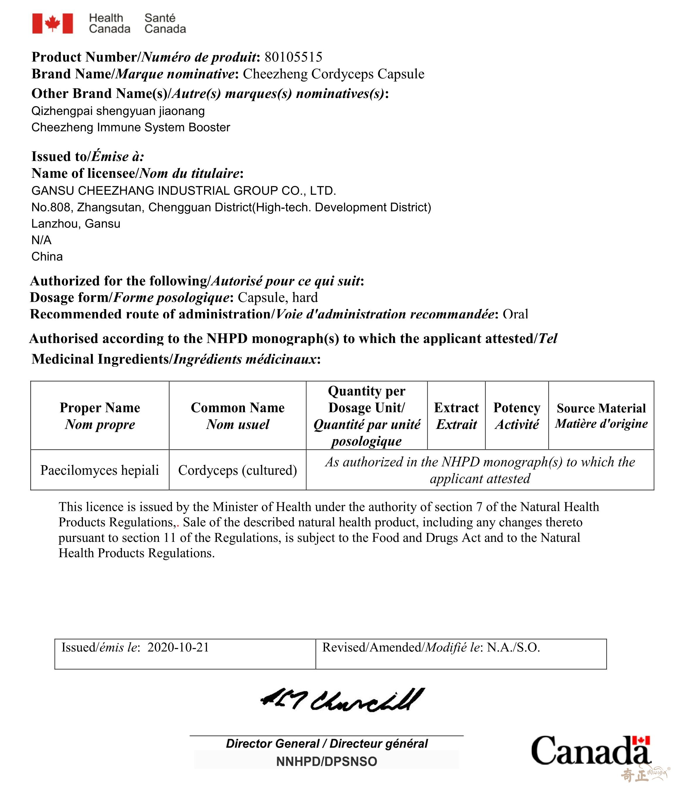 加拿大GMP證書-奇正牌圣元膠囊