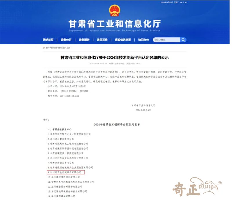 近日,甘肅省工業(yè)和信息化廳公示了2024年技術創(chuàng)新平臺認定名單,全省33家企業(yè)被認定為省級企業(yè)技術中心,蘭州奇正生態(tài)健康品有限公司榜上有名,成功躋身省級企業(yè)技術中心名錄。